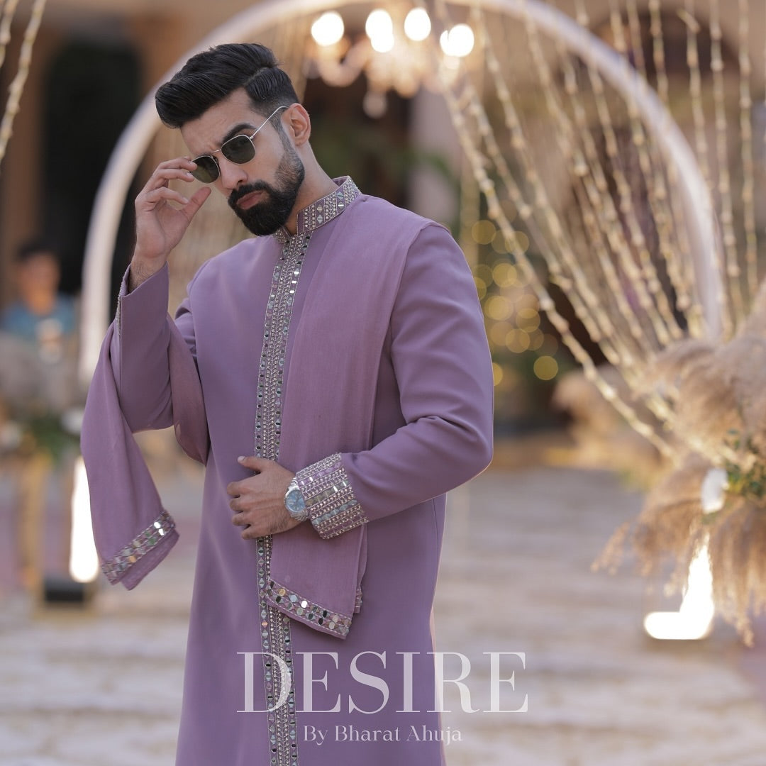 A regal statement in modern Indian menswear, this lavender sherwani set redefines elegance with its delicate mirror work. Featuring full mirror embroidery along the collar, placket, cuffs, and stole border, this ensemble exudes festive charm. Crafted for grooms and style-forward guests alike, the rich hue pairs seamlessly with ivory trousers and mojaris for a complete ceremonial look.