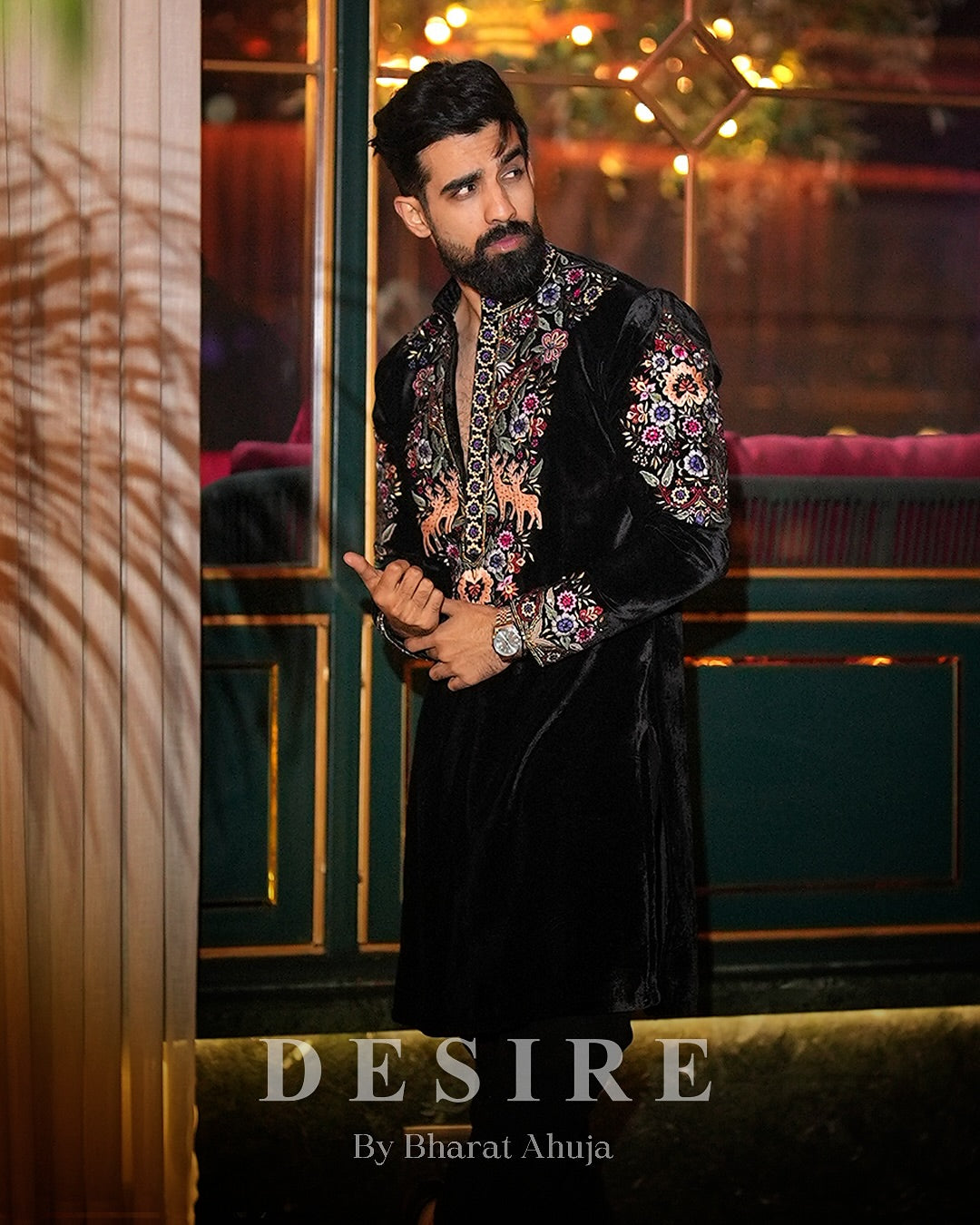 A royal fusion of regal charm and wild elegance, this black velvet indowestern is a celebration of intricate craftsmanship. It features richly embroidered multicolor floral and animal motifs, including delicate deer and foliage patterns, set against a lush velvet base. The collar and front placket are accentuated with detailed threadwork and mirror accents, adding a touch of heritage and luxury. Perfect for a groom or a standout wedding guest, this piece is designed to command attention under moonlit celebrations or grand festive settings.