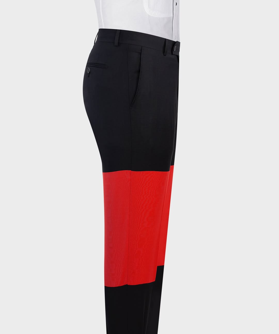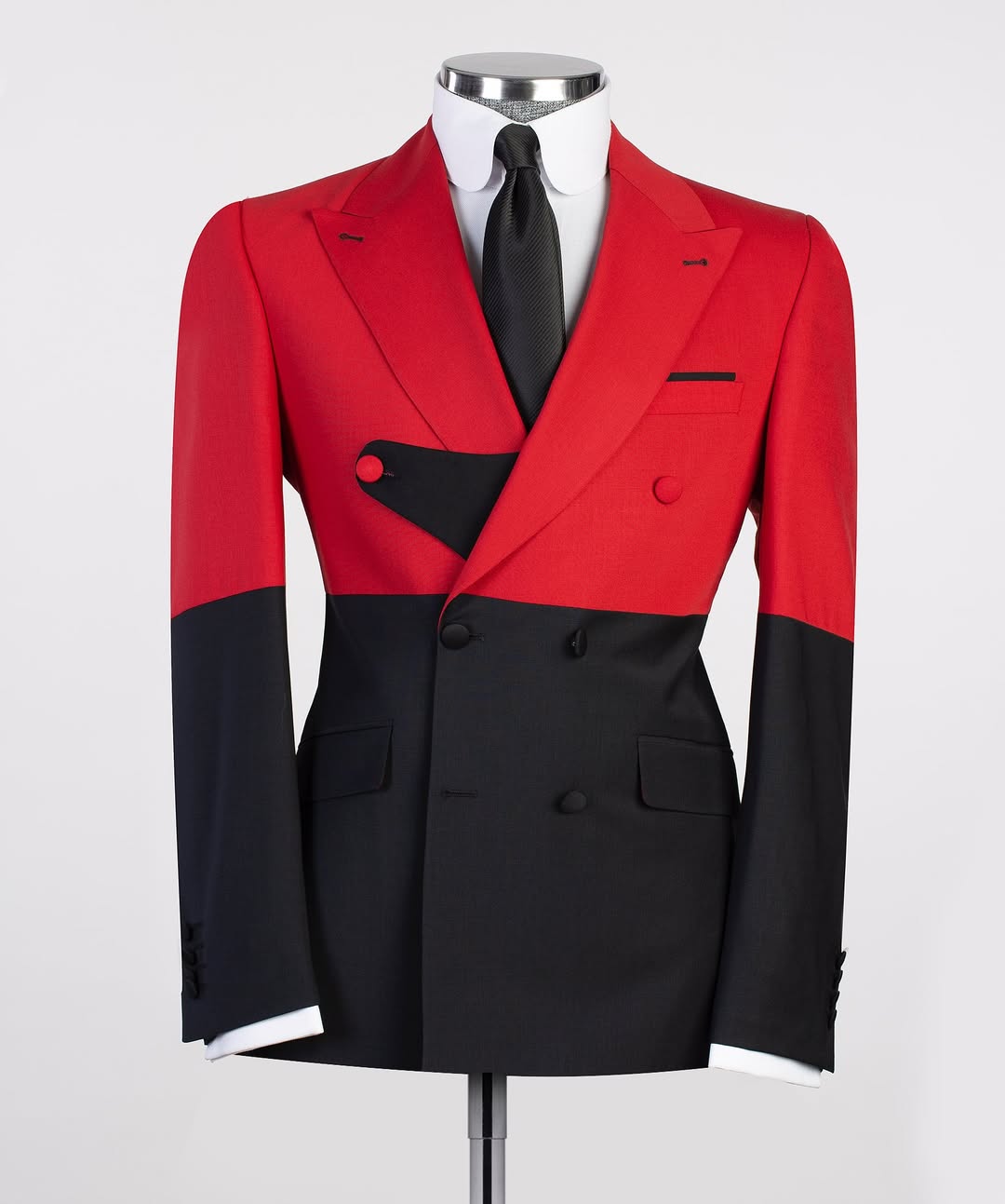 Command attention in the Crimson Command Tuxedo – a sharp, modern ensemble that redefines formalwear through fearless design. Featuring a bold two-tone split of deep red and black, this double-breasted suit is for the man who owns every room he enters. An asymmetrical crossover detail with contrast buttons adds a couture edge, while tailored lines and peak lapels ensure timeless sophistication.