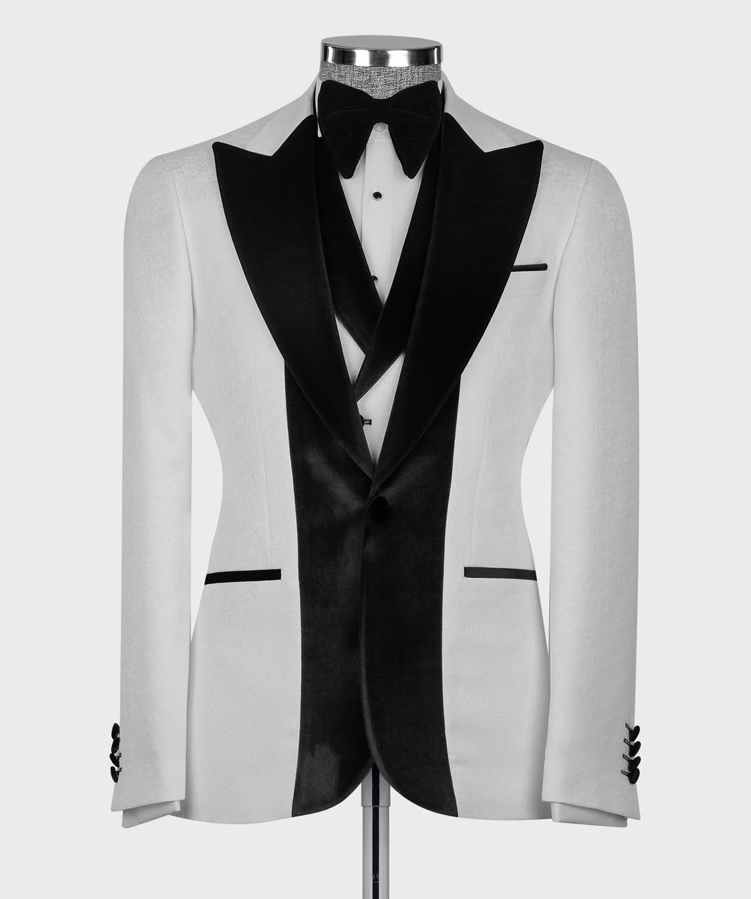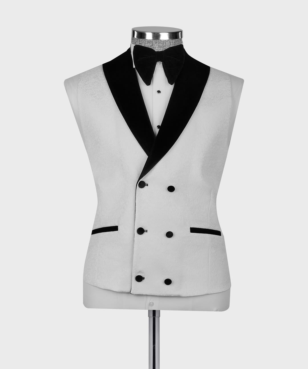 Command attention in the Monarch Noir Tuxedo – a contemporary tribute to timeless elegance. Crafted in an ivory brocade fabric, this double-breasted masterpiece showcases a deep black velvet peak lapel, evoking old-world glamour with modern tailoring finesse. With a crisp pleated dress shirt and a plush velvet bow tie, this ensemble is your passport to black-tie perfection.