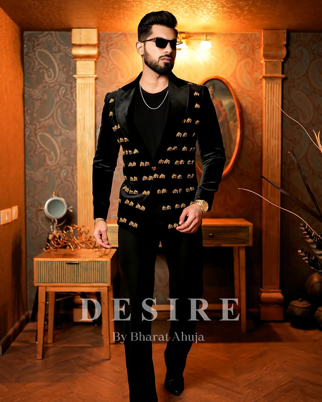 Command attention with every step in the Regal Black Velvet Elephant Embroidery Blazer. Crafted from plush velvet and adorned with intricate golden elephant motifs, this blazer channels royal heritage with a modern silhouette. Perfect for those who appreciate luxury with a cultural soul, it’s a blend of tradition, opulence, and bold confidence.