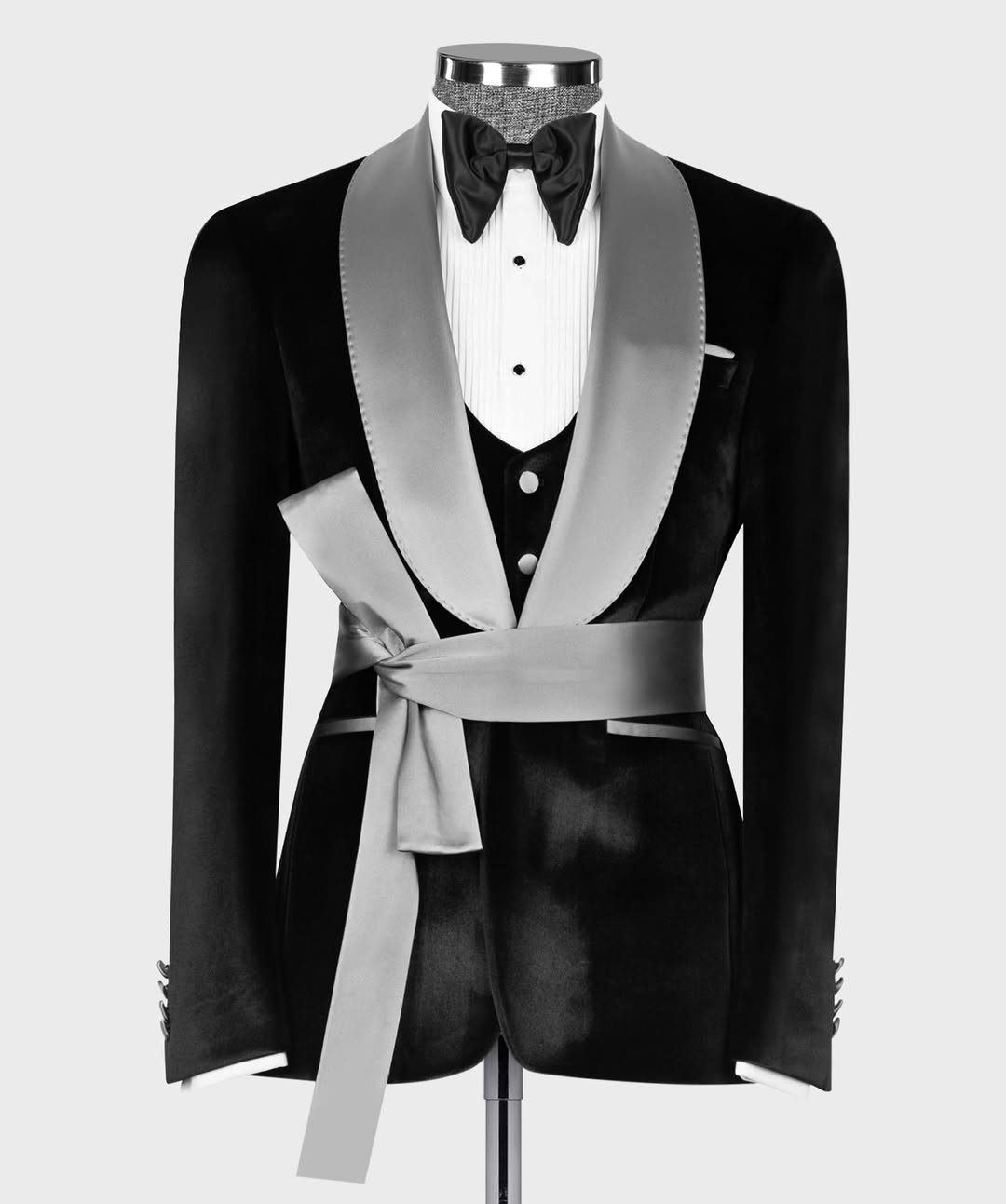 The Midnight Monarch Velvet Tuxedo is timeless luxury tailored to perfection. Draped in deep black velvet and finished with a satin dove-grey shawl lapel, this 3-piece set is a symphony of suave and sophistication. The detachable obi-style belt adds a dramatic touch, letting you flex between classic and contemporary. Crafted for the man who knows elegance is in the details.
